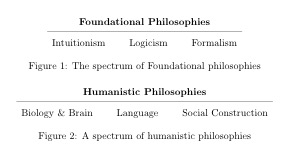 At first glance, Platonism, humanism, and the foundational views seem mutually exclusive (disjoint). If math is discovered “out there” then it can’t originate within us. If it comes from within us, then it isn’t a game we play, and certainly a meaningless game sounds nothing like the eternal truths of an 5 Humanistic Philosophies Mathematical Platonism/Realism Foundational Philosophies Intuitionism Logicism Formalism Biology & Brain Finite Axioms Language Countable (All Truth) Social Construction Uncountable (Kitchen Sink) Figure 4: A synthesis of views ideal realm. But perhaps this is a false trichotomy.